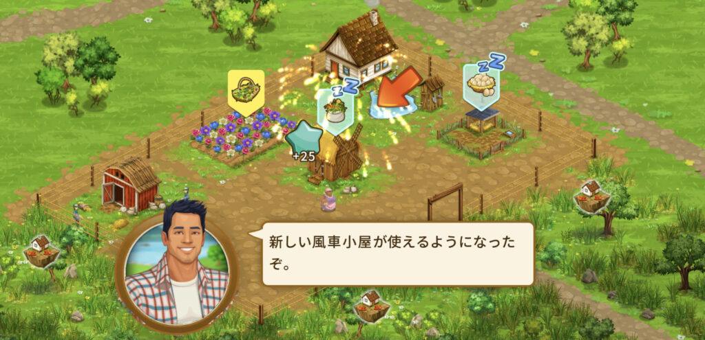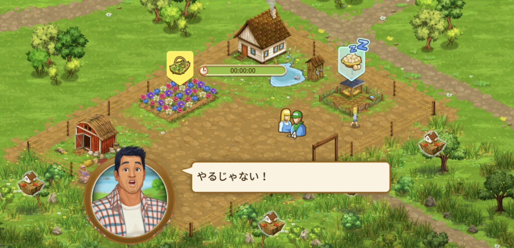 例えば、序盤の畑や小さな施設は数分〜数十分で完成するのでサクサク進みますが、