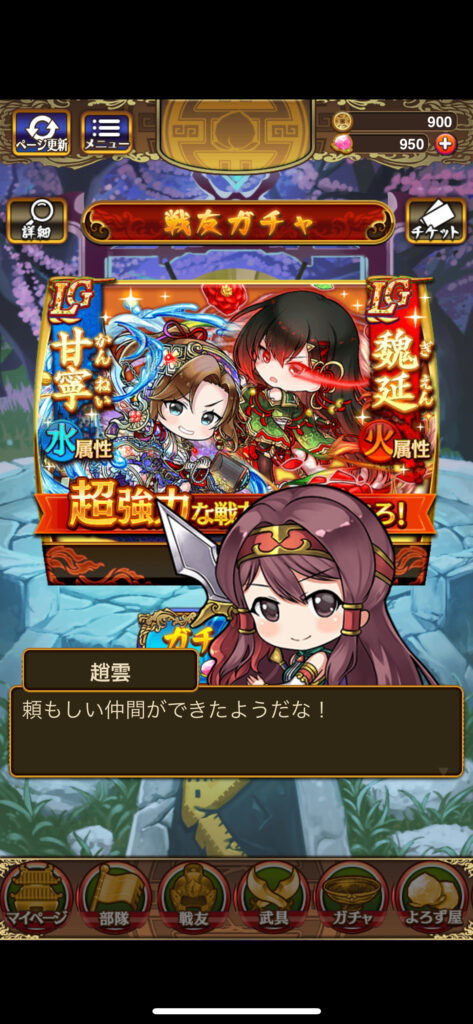 自分はこういうアプリゲームを片っ端からプレイしてきてます。理由はガチャが大好きでそれぞれのRPGにはガチャが付きものですが、ガチャひとつ取ってもゲームによってそれぞれ違った顔があって個性が異なるので引いてて面白いんです。そういう意味でもこの三国ドライブのガチャは本当に良いのがよく出る印象ですね!!